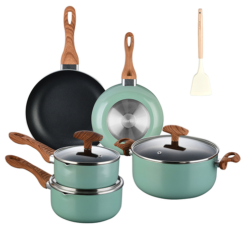 Modern Green Metal Cookware Set Alumínio Sustentável e Alumínio Fundido Utensílios De Cozinha para Uso Doméstico para Cozinhar a Vapor
